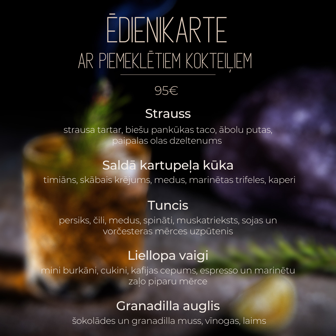 Tradicionālās svētku garšas mūsu šefpavāra improvizācijā, pasniegtas piecās kārtās, īpaši svinīgā atmosfērā ar pārsteidzošu galda klājumu.